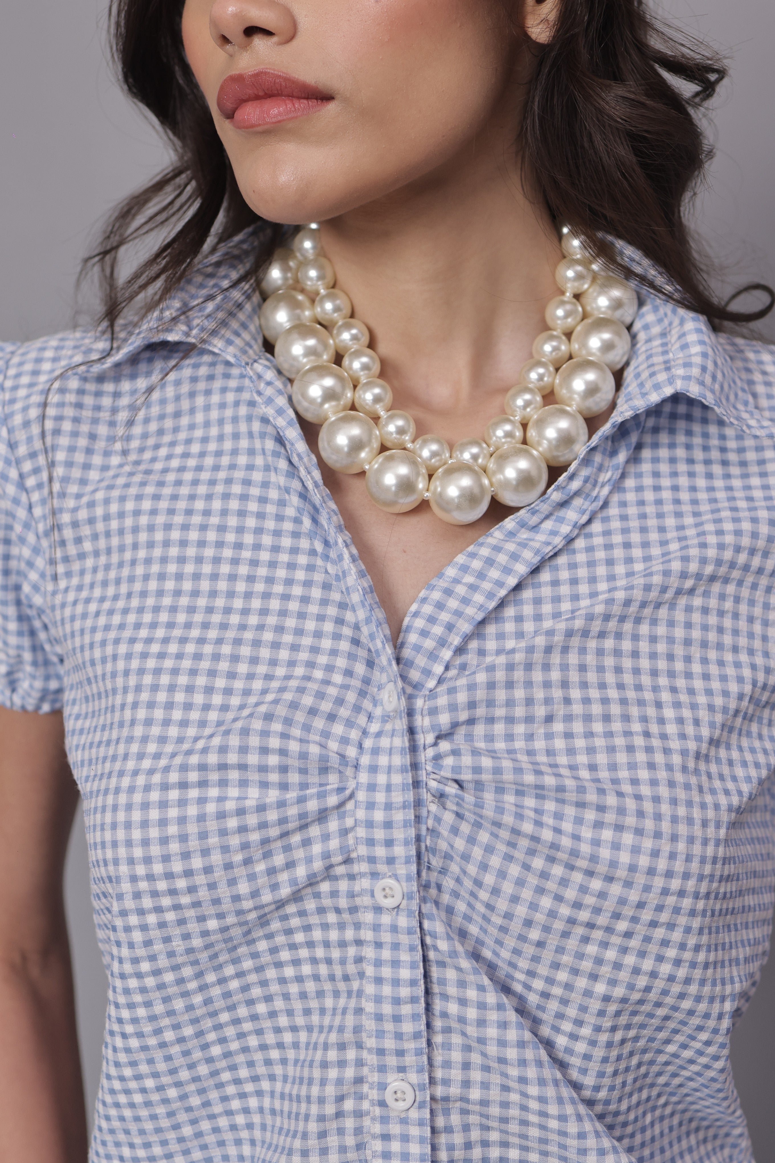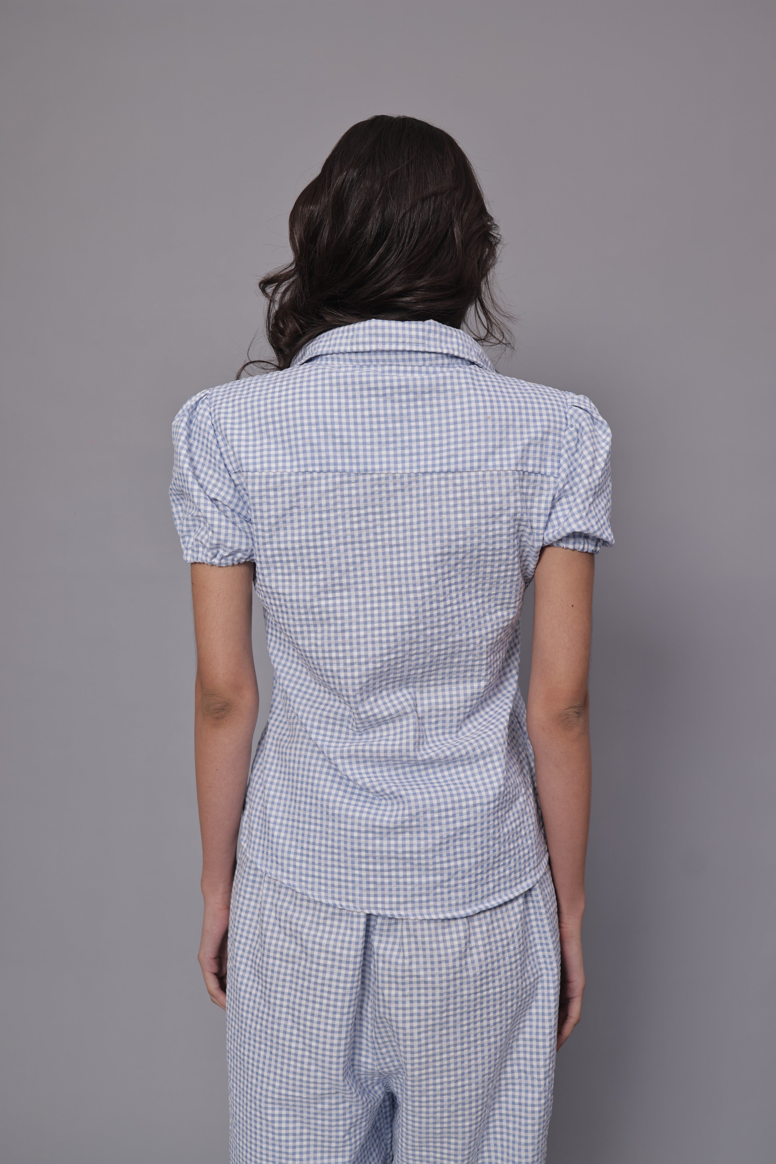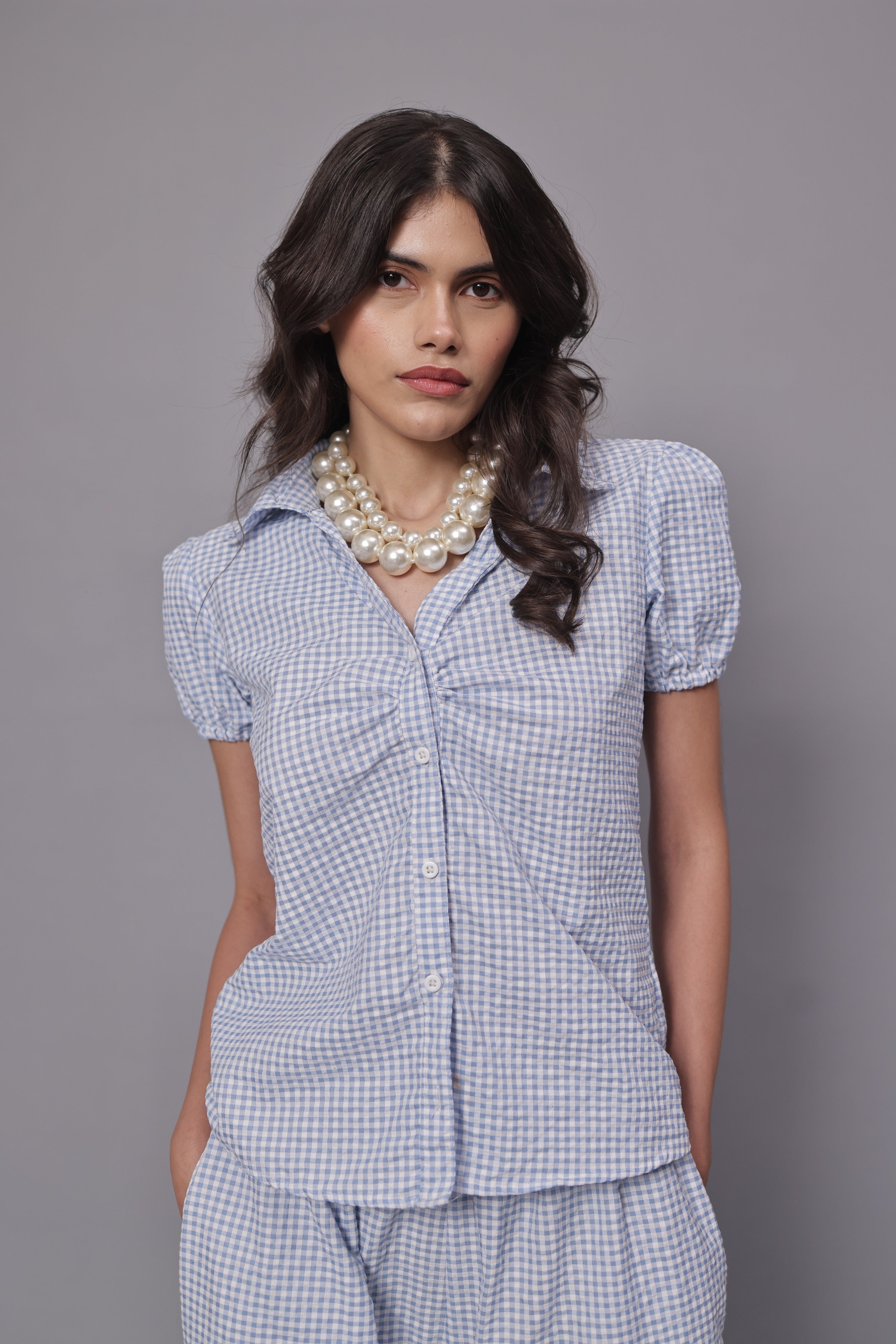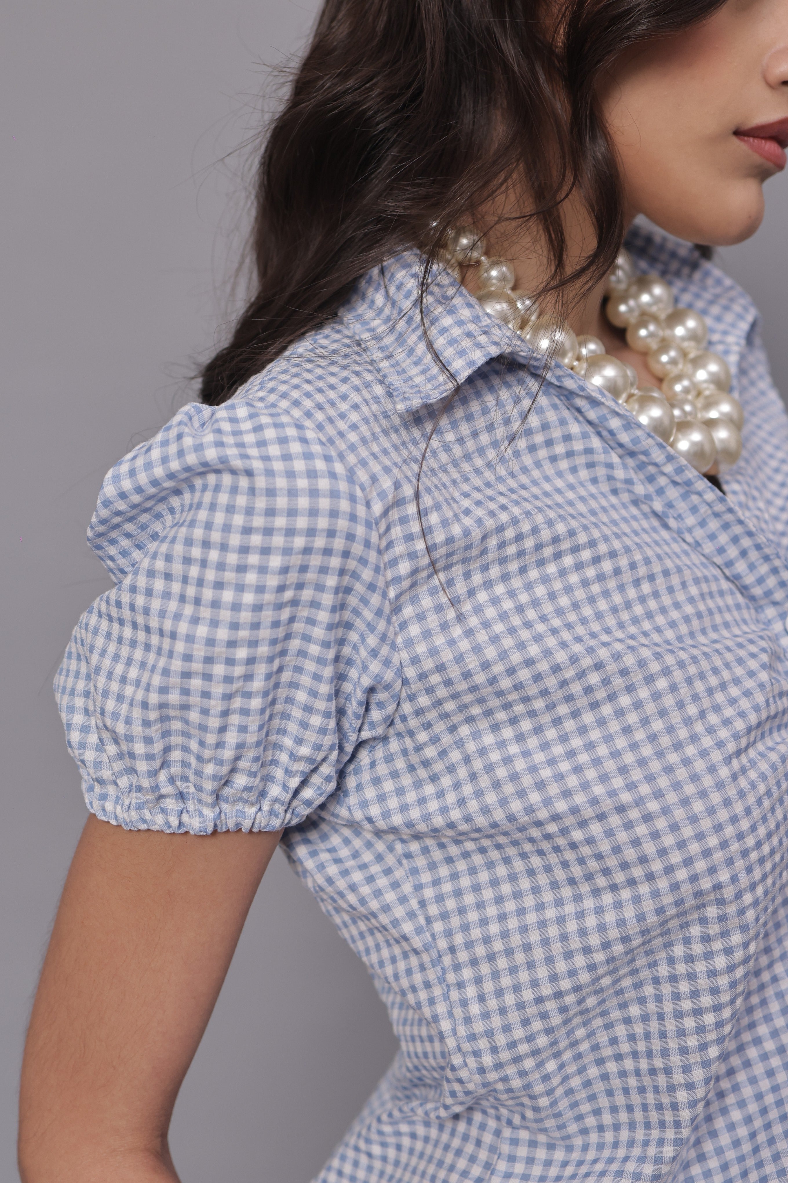 A playful twist on a classic, the Baby blue Shirt brings vintage charm with a modern fit. Featuring soft cotton fabric and puff sleeves, its your pick for days when cute meets comfy.