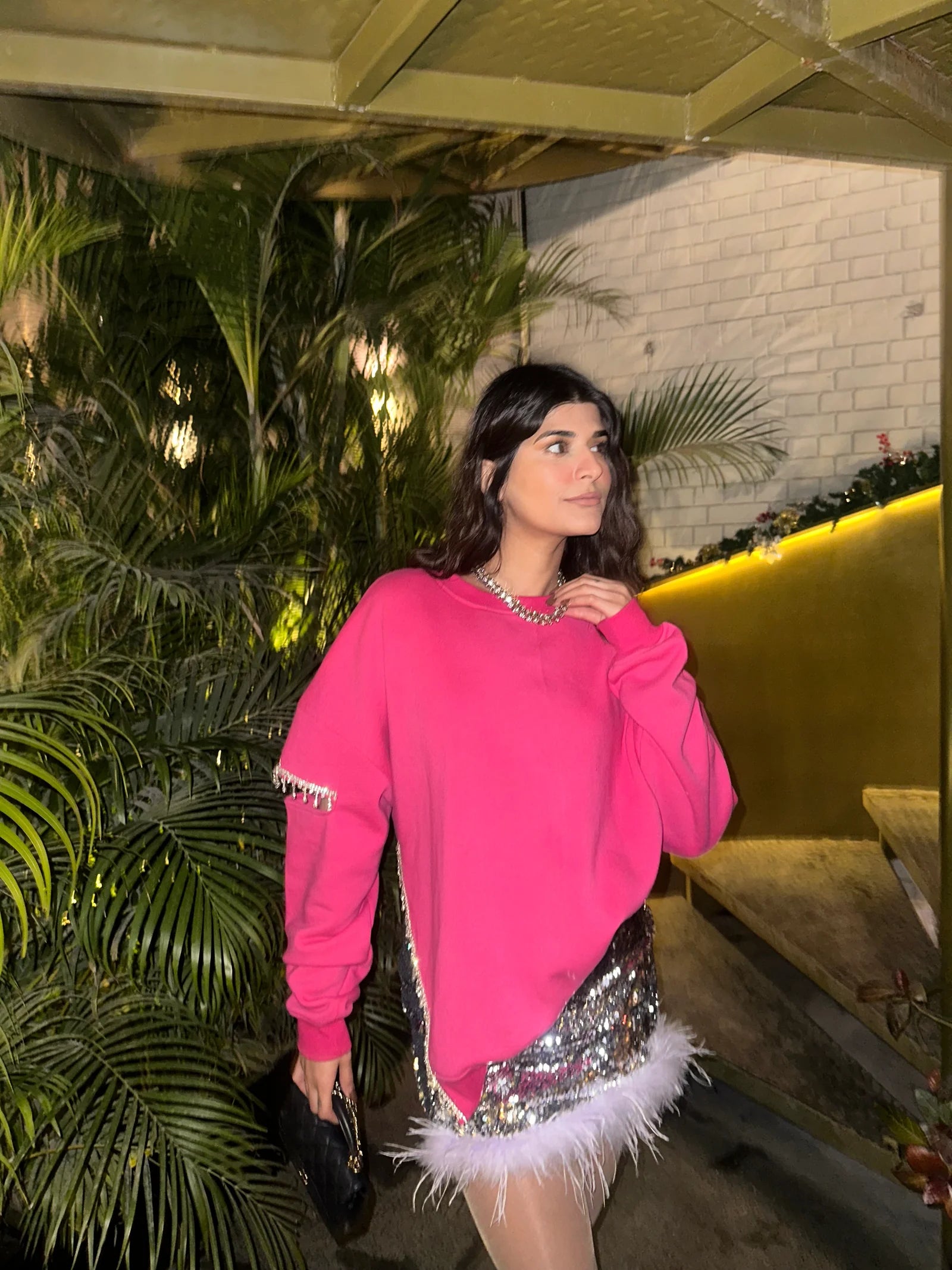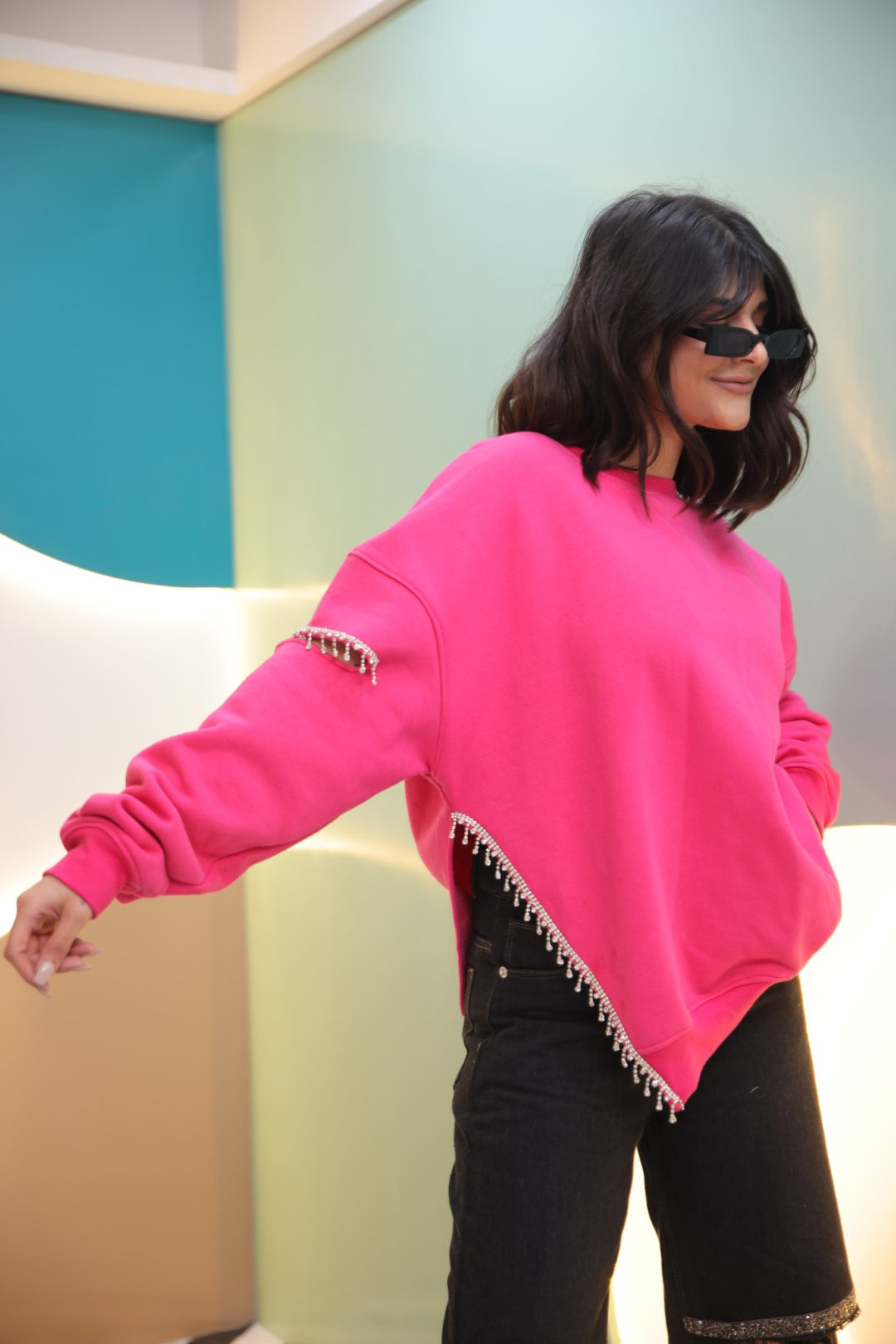 When cozy meets glam, you get the Crystal Love Pink Sweatshirt — your perfect pick for nights when you want comfort with a touch of sparkle. The soft, relaxed fit keeps things effortless, while the crystal detailing on the sleeve adds that chic, standout shine. Pair it with anything from denims to sequins and let the look do the talking.