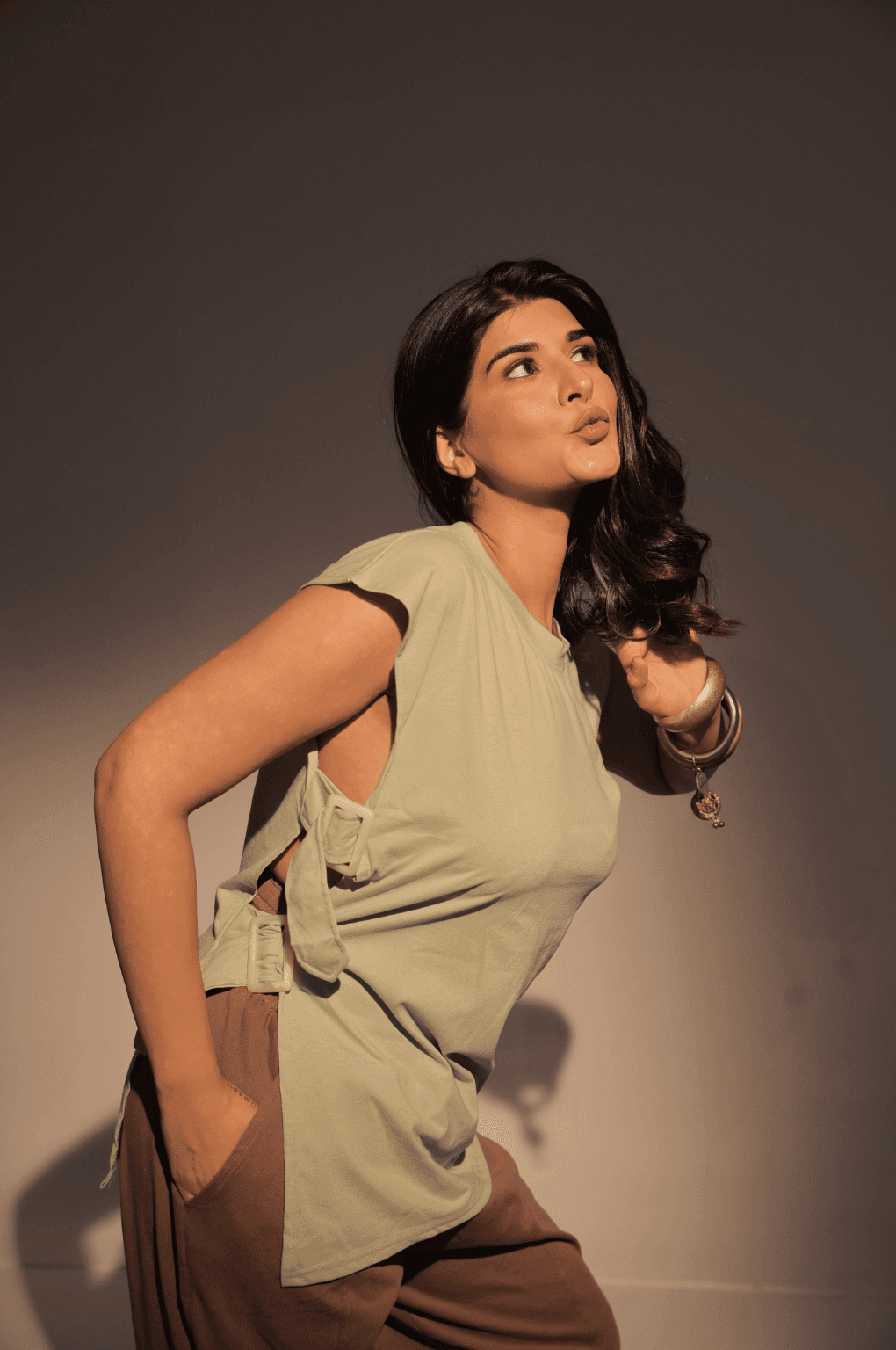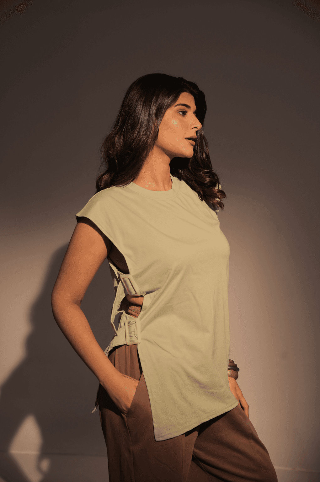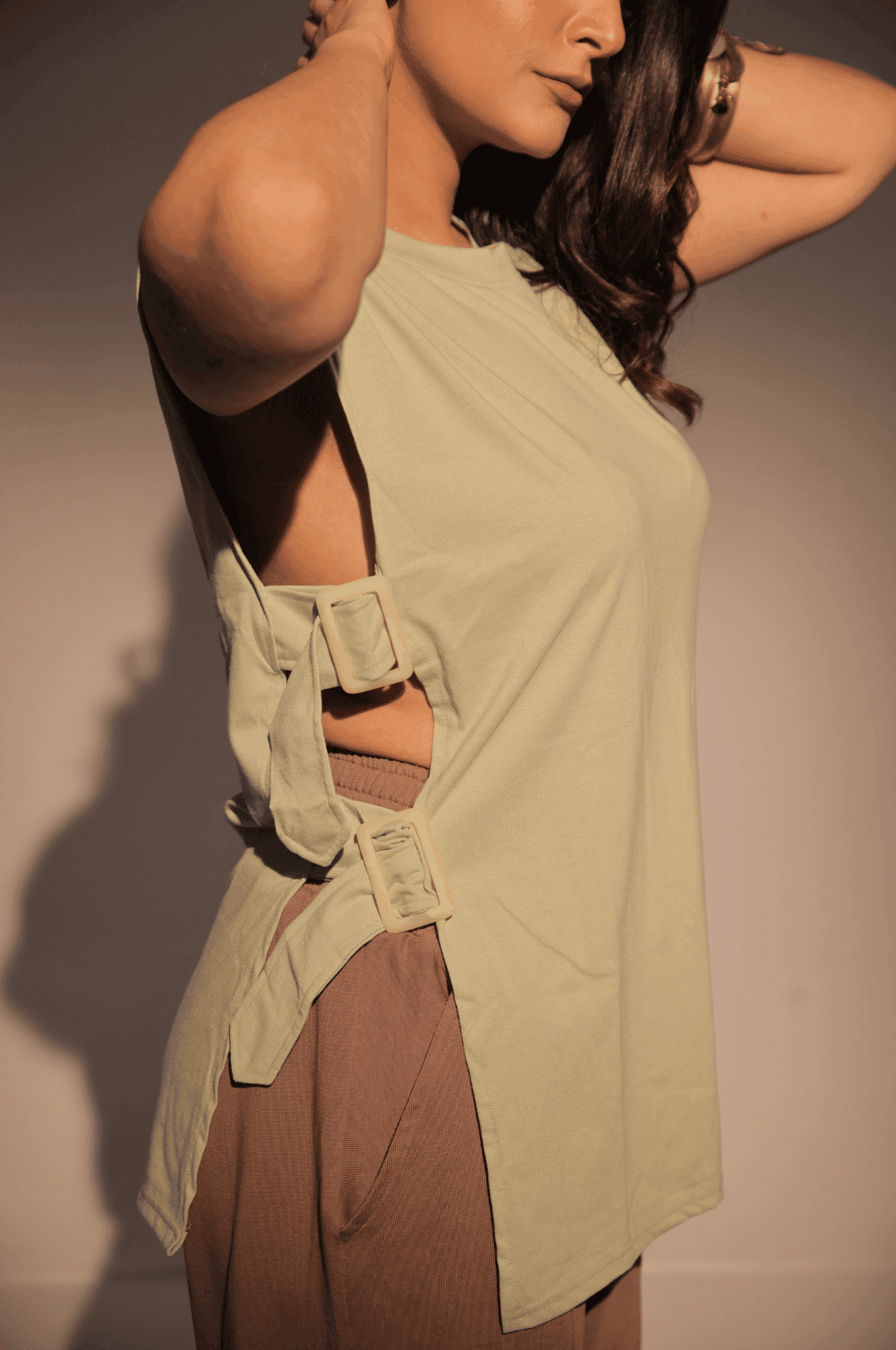 Add a twist to your basics with the Pistachio Buckle Detail Top. Its bold, unexpected, and super fun.